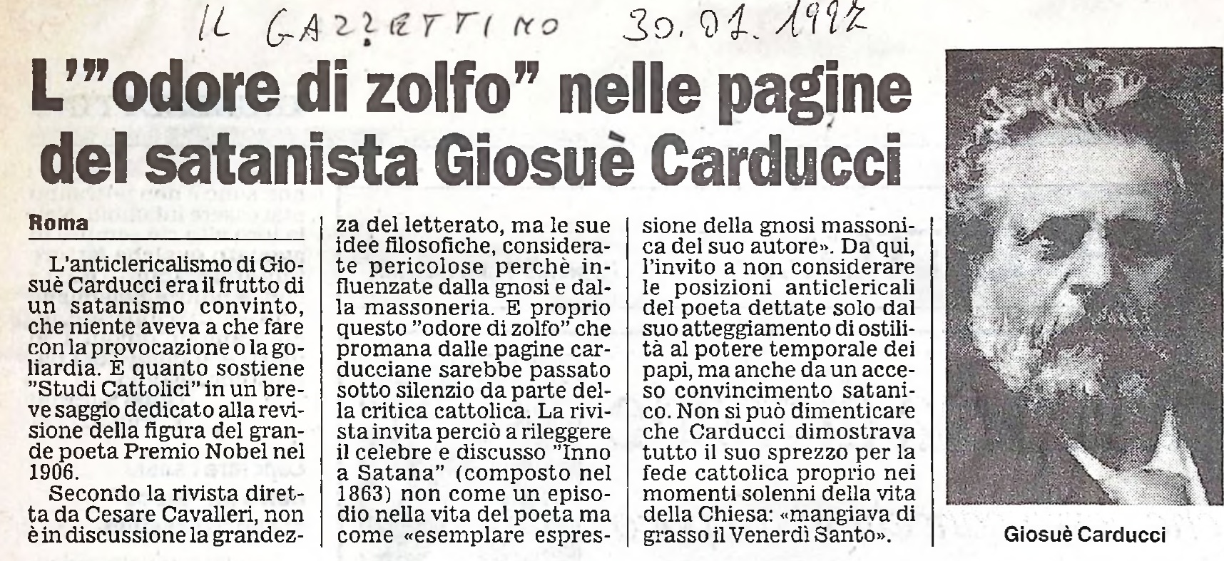 "L'anticlericalismo di Giosuè Carducci era il frutto di un satanismo convinto, che niente aveva a che fare con la provocazione o la goliardia. E' quanto sostiene "Studi Cattolici" in un breve saggio dedicato alla revisione della figura del grande poeta Premio Nobel nel 1906. Secondo la rivista diretta da Cesare Cavalieri, non è in discussione la grandezza del letterato, ma le sue idee filosofiche, considerate pericolose perché influenzate dalla gnosi e dalla massoneria. E proprio questo "odore di zolfo" che promana dalle pagine carducciane sarebbe passato sotto silenzio da parte della critica cattolica. La rivista invita perciò a rileggere il celebre e discusso "Inno a Satana" (composto nel 1863) non come un episodio nella vita del poeta ma come "esemplare espressione della gnosi massonica del suo autore". Da qui, l'invito a non considerare le posizioni anticlericali del poeta dettate solo dal suo atteggiamento di ostilità al potere temporale dei papi, ma anche da un acceso convincimento satanico. Non si può dimenticare che Carducci dimostrava tutto il suo sprezzo per la fede cattolica proprio nei momenti solenni della vita della Chiesa: "mangiava di grasso il Venerdì Santo".