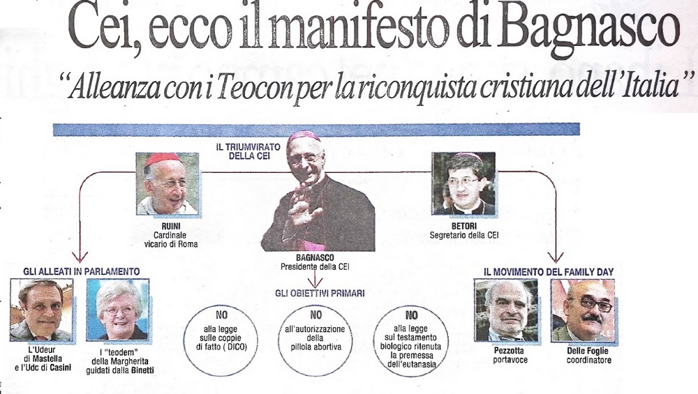 La chiesa cattolica si fece forte di una destra fascista, leghista e berlusconiana che sventolava crocefissi e rosari contro i loro doveri di ottemperare alle norme Costituzionali.