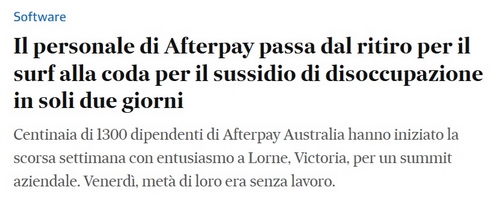 Centinaia di 1300 dipendenti di Afterpay Australia hanno iniziato la scorsa settimana con entusiasmo a Lorne, Victoria, per un summit aziendale, venerdì, della stessa settimana, metà di loro era senza lavoro.