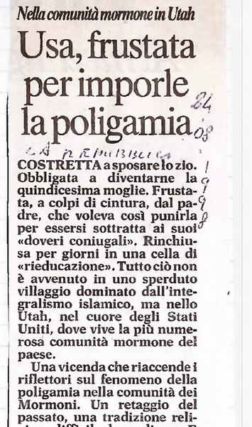 Nella comunità mormone in UtahUsa, frustata per imporle la poligamia