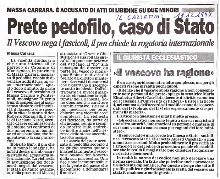 La vicenda giudiziaria che ruota intorno all'ex parroco di Capanne di Montignoso, in provincia di Massa Carrara, accusato di pedofilia, rischia di diventare addirittura un caso "internazionale". Questo dopo il rifiuto, da parte del vescovo diocesano di Massa Carrara e Pontremoli, monsignor Eugenio Bini, di consegnare al magistrato titolare dell'inchiesta il fascicolo che raccoglie la vita e la storia di don Roberto Marianelli, il prete di Licciana Nardi, accusato di aver commesso atti di libidine nei confronti di due minorenni, un bambino ed una bambina, che frequentavano la sua parrocchia.