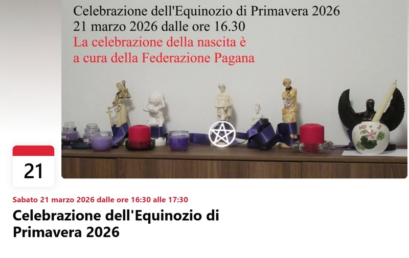 Il rito religioso dell'Equinozio di Primavera si svolgerà sabato 21 marzo 2026 dalle ore 16.30 in diretta sulla pagina mia pagina su Facebook. La celebrazione consisterà nella lettura degli Inni della nascita di alcuni Dèi per trasmettere i modelli religiosi propri della Religione Pagana. La celebrazione inizierà alle 16.30.