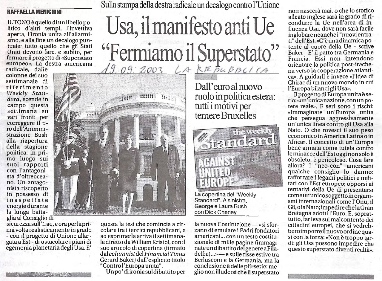 Per far comprendere quanto è storico l'odio degli USA per l'Europa riporto un articolo del quotidiano La Repubblica del 19 settembre del 2003. Allora non c'era la prospettiva di spingere l'Europa ad entrare in guerra con la Russia, ma gli USA presentavano la necessità di impedire la costruzione dell'Unione Europea per i loro interessi economici.