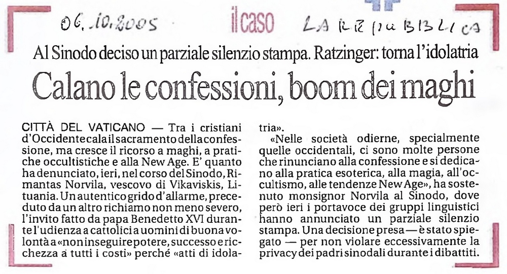 CITTà DEL VATICANO - Tra i cristiani d'Occidente cala il sacramento della confessione, ma cresce il ricorso a maghi, a pratiche occultistiche e alla New Age. E' quanto ha denunciato, ieri, nel corso del Sinodo, Rimantas Norvila, vescovo di Vikaviskis, Lituania. Un autentico grido d'allarme, preceduto da un altro richiamo non meno severo, l'invito fatto da papa Benedetto XVI durante l'udienza a cattolici a uomini di buona volontà a "non inseguire potere, successo e ricchezza à tutti i costi" perché "atti di idolatria "Nelle società odierne, specialmente quelle occidentali, ci sono molte persone che rinunciano alla confessione e si dedicano alla pratica esoterica, alla magia, all'occultismo, alle tendenze New Age", ha sostenuto monsignor Norvila al Sinodo, dove però ieri i portavoce dei gruppi linguistici hanno annunciato un parziale silenzio stampa. Una decisione presa - è stato spiegato - per non violare eccessivamente la privacy dei padri sinodali durante i dibattiti.