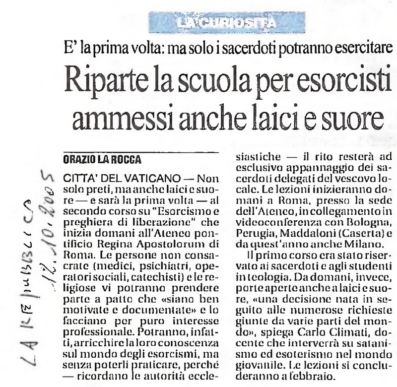 CITTA' DEL VATICANO - Non solo preti, ma anche laici e suore - e sarà la prima volta - al secondo corso su “Esorcismo e preghiera di liberazione" che inizia domani all'Ateneo pontificio Regina Aposlolorum di Roma. Le persone non consacrate (medici, psichiatri, operatori sociali, catechisti) e le religiose vi potranno prendere parte a patto che "siano ben motivate e documentate" e lo facciano per puro interesse professionale. Potranno, infatti, arricchire la loro conoscenza I sul mondo degli esorcismi, ma senza poterli praticare, perché - ricordano le autorità ecclesiastiche - il rito resterà ad esclusivo appannaggio dei sacerdoti delegati del vescovo locale. Le lezioni inizieranno domani a Roma, presso la sede dell'Ateneo, in collegamento in videoconferenza con Bologna, Perugia, Maddaloni (Caserta) e da quest'anno anche Milano. Il primo corso era stato riservalo ai sacerdoti e agli studenti in teologia. Da domani, invece, porte aperte anche a laici e suore, "una decisione nata in seguilo alle numerose richieste giunte da varie parli del mondo", spiega Carlo Chinati, docente che interverrà su satanismo ed esoterismo nel mondo giovanile. Le lezioni si concluderanno a febbraio.