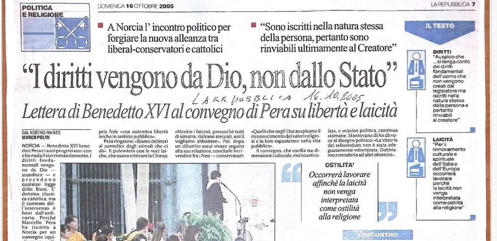 NORCIA - Benedetto XVI benedice Pera e i suoi progetti neo-conservatori e formula il suo comandamento. I diritti fondamentali vengono da Dio - scandisce - e precedono qualsiasi legge dello Stato. E' dottrina classica cattolica, ma il contesto dell'intervento è fuori dall'ordinario. Perché Marcello Pera ha riunito a Norcia per un convegno squisitamente politico, oltreché culturale, intellettuali ed esponenti di partito (da Formigoni di Forza Italia a Mantovano di An) con lo scopo di forgiare la nuova alleanza tra liberal-conservatori e cattolici. "Libertà e laicità" è il tema.