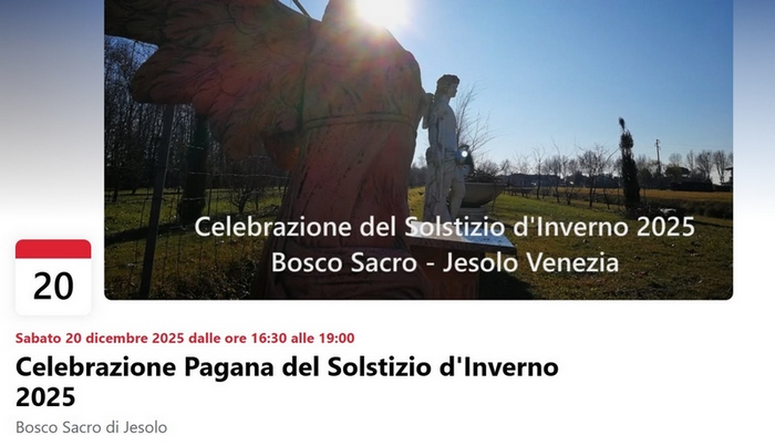 Il rito religioso del Solstizio d'Inverno è organizzato dalla Federazione Pagana presso il Luogo di Culto del Bosco Sacro in Jesolo, Venezia il giorno 20 dicembre 2025 dalle ore 16,30 e terminerà alle 19.00 circa.