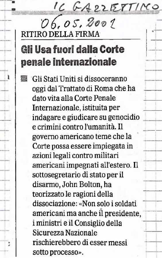 Gli Stati Uniti si dissoceranno oggi dal Trattato di Roma che ha dato vita alla Corte Penale Internazionale, istituita per indagare e giudicare su genocidio e crimini contro l'umanità. Il governo americano teme che la Corte possa essere impiegata in azioni legali contro militari americani impegnati all'estero. Il sottosegretario di stato per il disarmo, John Bolton, ha teorizzato le ragioni della dissociazione: "Non solo i soldati americani ma anche il presidente, i ministri e il Consiglio della Sicurezza Nazionale rischierebbero di esser messi sotto processo".
